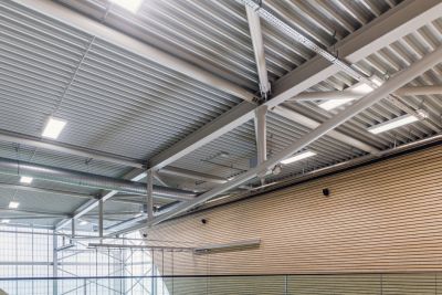 Tekst: De sporthal en gym zijn opgetrokken in staal, alsook een luifelstructuur, diverse toegangstrappen en loopbrugjes. Het geheel werd opgevat als een in beide richtingen geschoorde hal. Om de 7,50 m werd een portiek geplaatst die 33,40 m overspant. Om de structuur een brandweerstand van R30 te bezorgen, volstond het per dakligger slechts 2 verticale buizen met een zwelverf te omhullen. De rest van de structuur haalt uit zichzelf de gevraagde brandweerstand.