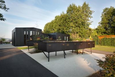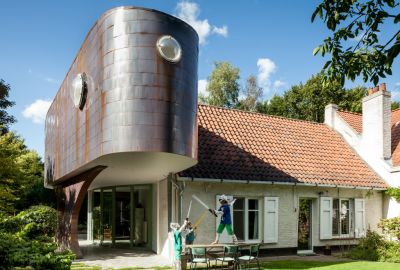 Tekst: Om deze uitbreiding een uitgesproken karakter mee te geven werd geopteerd voor een soort retro-futuristische ruimtecapsule, met een knipoog naar science-fiction. De draagstructuur bestaat uit staal, waardoor het zwevend effect van deze uitbreiding gerealiseerd kon worden. Bovenop en tussen de staalstructuur werd een houtskelet gebouwd. Deze werd aan de buitenzijde met koper bekleed.