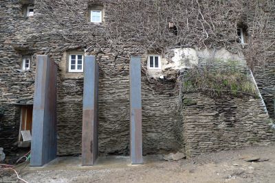 Tekst: Het project heeft tot doel een schuur uit 1730 om te vormen tot woning. Het idee is om de bruikbare oppervlakte te vergroten om er de leefruimten in onder te brengen op de gelijkvloerse verdieping (keuken, salon en woonkamer) en de slaapkamers op de verdieping (slaapkamer voor de volwassenen, bureau en badkamer). De uitbouw krijgt een bekleding van cortenstaal, dat – hoewel hedendaags – perfect past bij de bruin-oranje kleuren van de plaatselijke natuursteen.