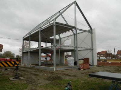 Tekst: Deze staalframebouw, opgetrokken de bouwmethode van be-Steel, is vervaardigd uit koudgevormd staal, dat een mettalische behandeling kreeg die bijzonder corrosie- en slijtagebestendig is (Magnelis ArcelorMittal S350 GD + ZM310). De wanden in staalframepanelen zijn gemaakt uit C-profielen van 89 mm in een staaldikte van 1,2 mm. De vloeren bestaan eveneens uit C-profielen, ditmaal 250 mm hoog met een totale overspanning van 8 m, de volledige breedte van elke woning.