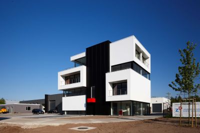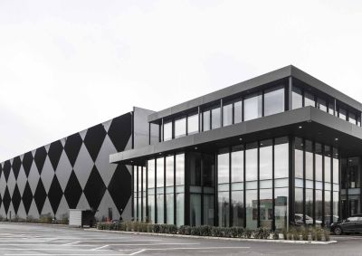 Tekst: Het bestaande éénlaagse, architecturaal gedateerde pand kreeg er een totaal nieuw volume bovenop. De opbouw gebeurde met stalen portieken op een raster van 6 m en is op 90 paalfunderingen gezet. Voor het bovenste volume werd gekozen voor een accentuerende, zwarte gevelbekleding. Deze bestaat uit voorgelakte geprofileerde staalplaten met 150 mm isolatie. In de inkom is een stalen trap voorzien, die in bovenaanzicht de vorm heeft van het driehoekig logo van het bedrijf.