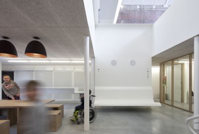 Tekst: <p>Het centrale gebouw op de Blaironsite, laat verschillende onderwijslokalen op elkaar aansluiten via een multifunctionele ontvangstruimte met een brug op verdiepingshoogte. Hierboven is een bibliotheek met twee bouwlagen, open vide en trappartij gehuisvest. <br>