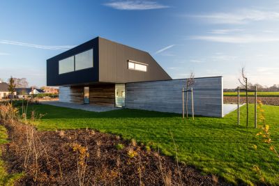 Tekst: Deze vrijstaande woning bevindt zich aan de rand van een landelijke woonkern. Een matzwarte stalen doos hangt over een houten wand. De geïntegreerde liggers en vakwerken van de stalen hoofddraagstructuur maken het mogelijk om de uitkraging op een eenvoudige manier te realiseren. Een staalskeletwoning kan meer bewoonbare oppervlakte met ruimere glaspartijen bieden voor dezelfde bouwkost. Een coherent ontwerp, bedacht vanuit staalbouw, kan een besparing tot 20 procent opleveren.
