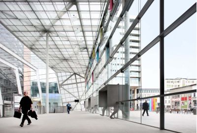 De aankomsthal is het centrale knooppunt van trein, metro, tram, bus, taxi, ondergrondse fietsenstalling en parkeergarage en commerciële ruimten.<br>