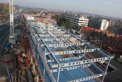 Tekst: <p>De staalstructuur van het kantoorgebouw van de ZAC in Bruyères bestaat in hoofdzaak uit een draagstructuur voor een staalplaatbetonvloer, waarbij de liggers met deuvels in het beton verbonden zijn zodat deze liggers als samenwerkend staal-beton worden berekend. Daardoor worden de spanningen in het staal kleiner en is de doorbuiging beperkter.<br>