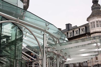 Tekst: Een stalen schrijnwerk van ronde glasroedes voor de oude gevels van het stadhuis fungeert naast hekwerk ook als structuurelement. Het is samengesteld uit dikwandige ronde kokerprofielen voor de spijlen en fijne, gelaste T-profielen voor de dakliggertjes. De ronde kolommetjes zijn onderaan ingeklemd om vervorming van de gevel door windbelasting te beperken. De horizontale stabiliteit werd verzekerd door horizontale latten in de kopgevels.