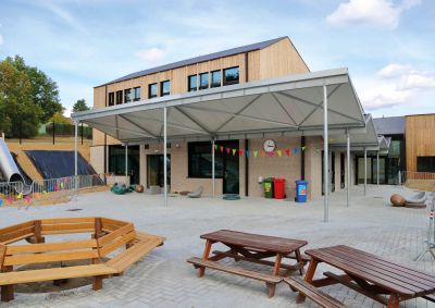 Tekst: <p>Vlak bij de kerk van Loonbeek, op een enigszins ‘verborgen’ site achter een historische en recentere bebouwing aan de Sint-Jansbergsteenweg, werd een nieuwbouw met een lagereschool- en kleuterafdeling opgetrokken. In het ontwerp werd de relatie met de glooiende omgeving versterkt via de weloverwogen inplanting van het gebouw én de interactie tussen buiten en binnen via uitgekiende zicht- en toegangsopeningen in de gevels, die zijn afgewerkt met klassieke gevelsteen en verticaal houten latwerk.</p> <p>Samen met de geknikte dakvormen creëert de kronkelende stalen luifel (13,5 x 5 meter + 11,7 x 2,6 meter) een speelse, kleinschalige uitstraling, waardoor het geheel een uitnodigend karakter krijgt. De karakteristieke luifel bestaat uit gegalvaniseerde kolommen, liggers en een dakbedekking in sandwichpanelen. Hij versterkt een eerste as vanaf de schoolpoort naar de beglaasde hoofdinkom en vormt op die manier een ideaal oriëntatiepunt voor bezoekers. </p>