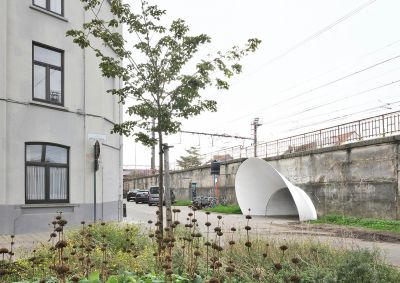 Tekst: <p>Een voetgangerstunnel onder de spoorweg in Ledeberg verbindt twee stadsdelen voor het zacht verkeer. Door diverse technische randvoorwaarden is deze tunnel laag en onaangepast maar niettemin een essentiële verbinding voor veel inwoners van de stad.</p> <p>Het project heeft tot doel de atypische beweging die de tunnel aanneemt, te verscherpen door de hoeken vormelijk te accentueren. Door het plaatsen van een stalen structuur die in dialoog gaat met het reeds bestaande perspectief worden de hoeken en het doorzicht duidelijker gedefinieerd. Op het vlak van materialiteit zoekt het project de relatie op tussen rauwe baksteen enerzijds en de huiselijke sfeer anderzijds.</p> <p>De luifel zet de kwaliteiten van staal in de verf. Het geheel bestaat uit een 15 mm dikke staalplaat die in een conische vorm is geplooid en vastgebout in de fundering. Door zijn vorm en materiaal is de luifel autostabiel en heeft ze geen verdere verstevigingen nodig. </p>
